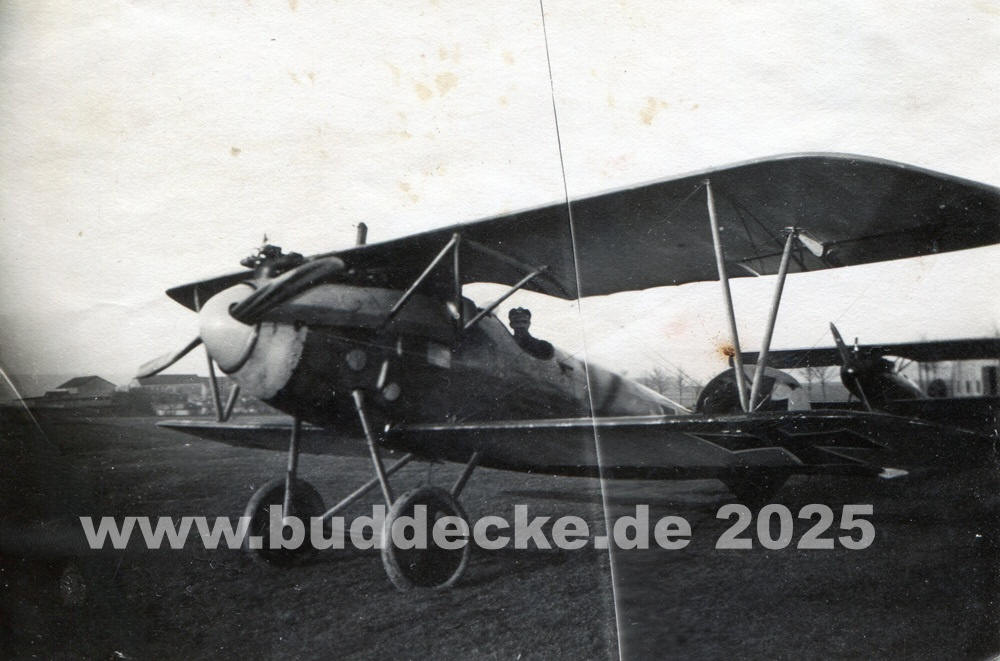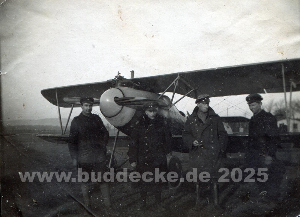 Im Hintergrund ein Kampfeinsitzerflugzeug Typ Albatros D.III