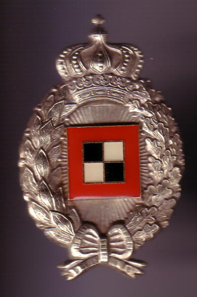 The observer´s badge The Observer´s badge was introduced on 27th January 1914 by the Kaiser (Army Order 1914 number 13). It consists of a silver metal wreath (oak leaves on the left, laurel leaves on the right). In the center of the wreath a black and white enameled sqare and on the top the Kaiser´s crown. It was awarded to officers who had a practice (on observer´s duty) of altogether at least 1000 km. It was worn on or below the left breast pocket. The Bavarian version of the badge has the bavarian king crown on top. |