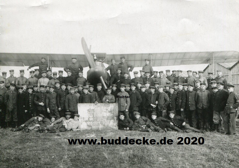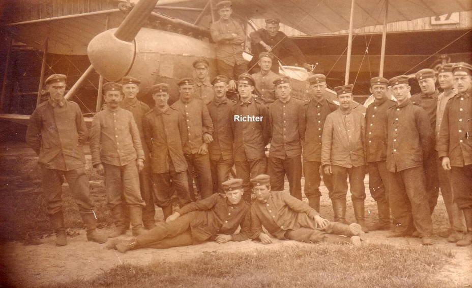 im Jahr 1918 Gruppenaufnahme Monteure der Fliegerbeobachterschule Warschau am 1.10.1918 Oberflugwart Richter mit seinen Monteuren