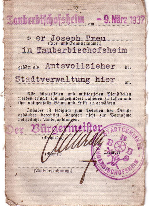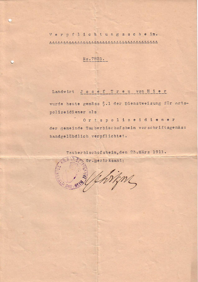 Stadt Tauberbischofsheim gewählt und am 23.03.1911 als Polizeidiener