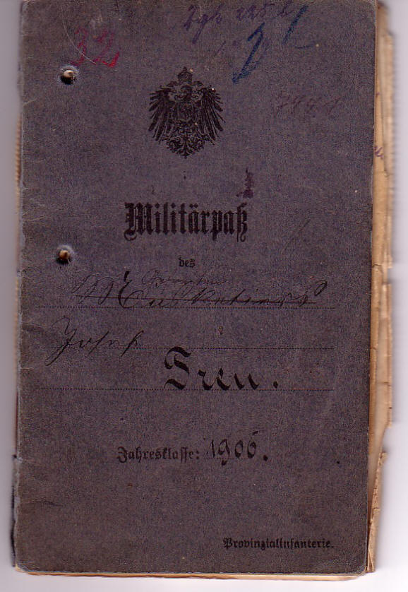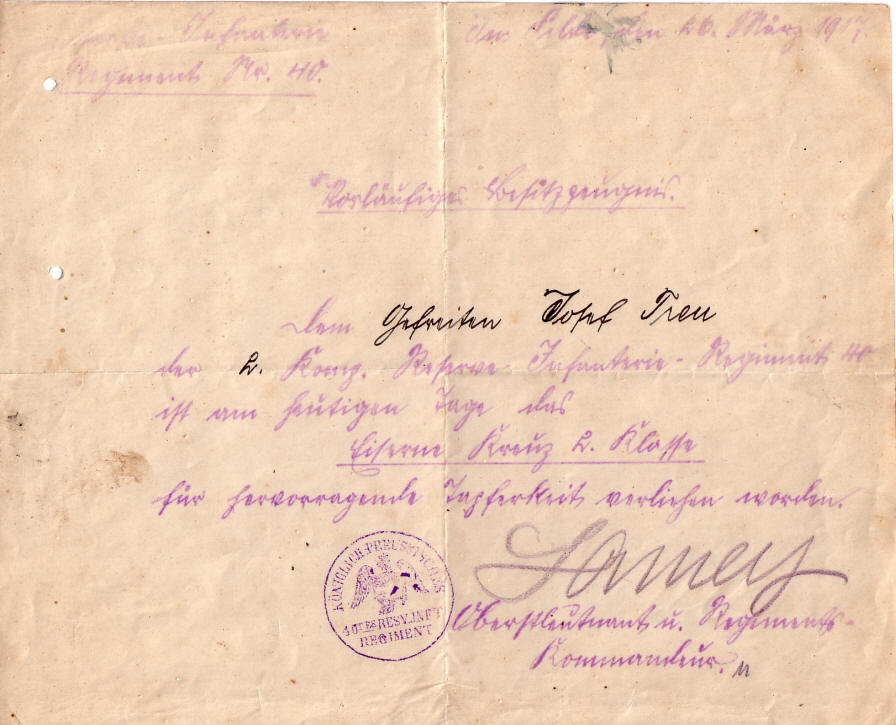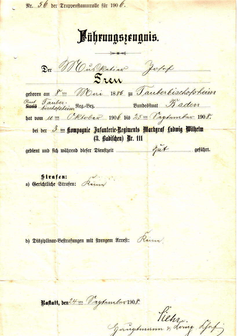 Am 10.10.1906 wurde Josef Treu als Rekrut des Infanterie-Regimentes