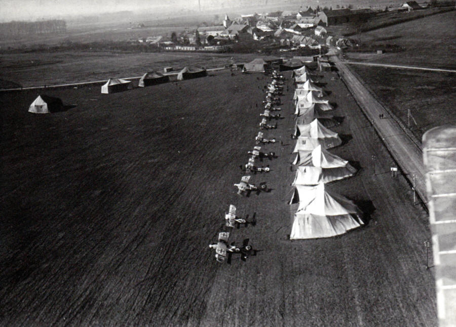 von Tutschek überfliegt mit seinem Fokker Dr. I 404/17 den Fluplatz