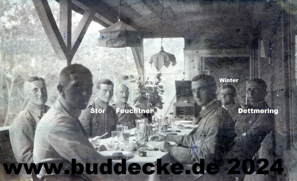 Gemeinschaftliches Essen bei der Jasta 68. Erkannt wurden: Vfw. Wilhelm Stör,