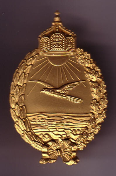 The Naval Pilot´s Badge (overland) This badge was introduced on 23rd February 1915 by the Kaiser. See following Navy order number 64. It corresponds with the Navy Pilot´s Badge (sea) with difference that the eagle is flying over land. The Badge was a awarded on completion of flying training and was worn on, or below the left breast pocket.